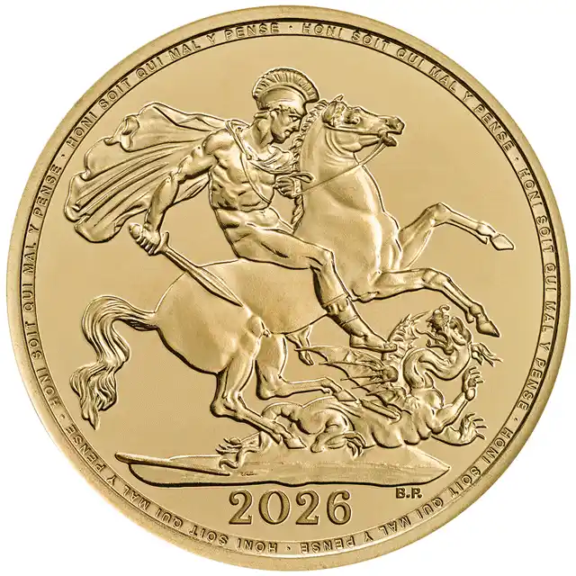 - Benedetto Pistrucci’s classic depiction of St George slaying the dragon once again graces the coin’s reverse